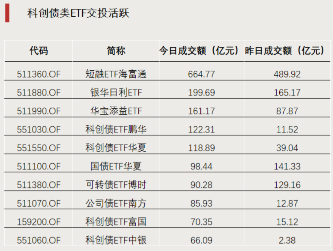 从4月24日的成交额数据来看,交投活跃的ETF集中在固收赛道。短融ETF海富通以664.77亿元的成交额大幅领先。鹏华、华夏、富国、中银等多只科创债ETF成交额较前一交易日大幅放量。