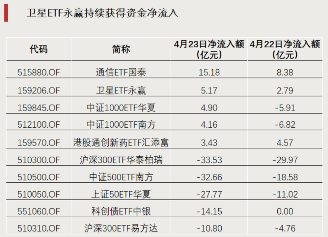 4月23日,资金从大盘蓝筹向中小盘及主题赛道转移。通信、卫星、中证1000、港股通创新药等ETF获资金净流入。